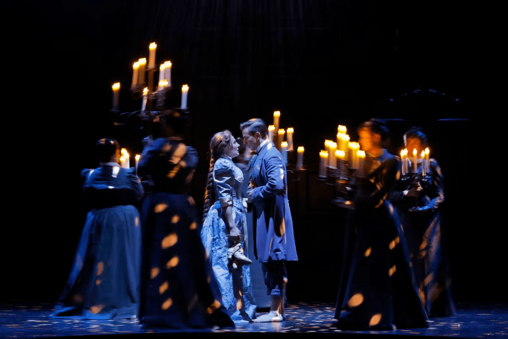 Andrew Boyce’s somber, claustrophobic scenic design used a coffered wood backdrop and an armoire that became a kind of magical door to other realms—its bottom drawer was pulled out to become the fountain where Mélisande loses Golaud’s ring. Lighting designer Connie Yun kept the shadows long; Jacob A. Climer’s early 20th-century costumes hit their mark, especially when Mélisande, arriving at the castle, is trussed into a full corset, bodice and skirt. Once her romance with Pélleas is under way, she wears filmy nightwear; as she dies in the now snow-filled armoire, she has regressed to the traumatized state in which Golaud first found her.